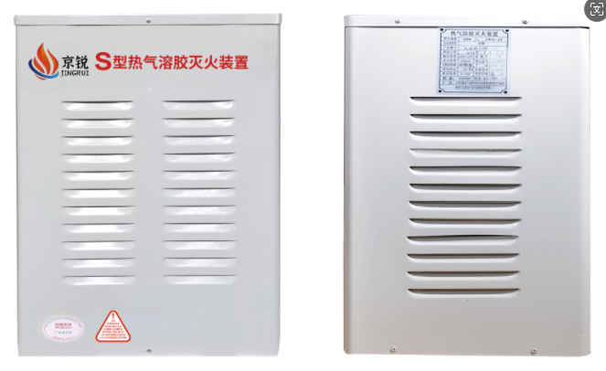 灭火装置主要由药筒、气体发生器、箱体组成。药筒由电点火器、引燃药、灭火药剂和外壳组成,药简装在气体发生器内。气体发生器一般由消焰冷却室和冷却室组成,发生器装在箱体内。箱体只起保护装饰作用,根据不同型号一个箱体可装数个气体发生器。